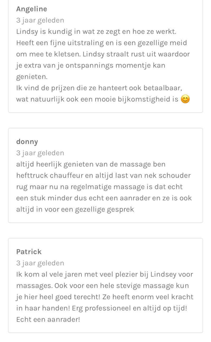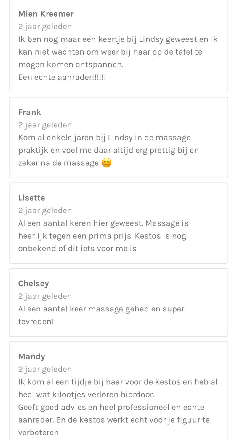 Ik kom al 6 jaar bij Lindsy, en mijn man en zoon ook. Perfecte manier om mezelf te laten verwennen. Super ontspannend. Maakt niet uit of de gezichtsbehandeling doe of massage (meestal allebei, lekker 2 uur genieten 😴). Vandaag door Myrthe gemasseerd (scrub massage), was ook heerlijk!!!!